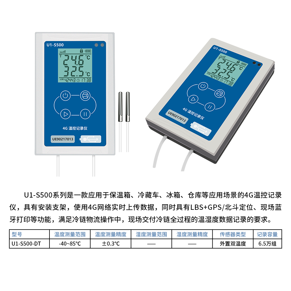 U1-S500 系列是一款應(yīng)用于保溫箱、冷藏車、冰箱、倉(cāng)庫(kù)等應(yīng)用場(chǎng)景的4G溫控記錄儀,具有安裝支架,使用4G 網(wǎng)絡(luò)實(shí)時(shí)上傳數(shù)據(jù),同時(shí)具有LBS+GPS/北斗定位、現(xiàn)場(chǎng)藍(lán)牙打印等功能,滿足冷鏈物流操作中,現(xiàn)場(chǎng)交付冷鏈全過(guò)程的溫濕度數(shù)據(jù)記錄的要求。